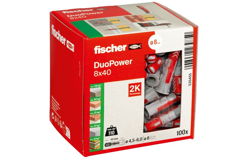 De fischer DuoPower 8x40 is een slimme 2-componenten plug die zich automatisch aanpast aan het bouwmateriaal. Dankzij de combinatie van hard en zacht kunststof biedt deze plug optimale prestaties bij bevestigingen in zowel massieve als holle bouwmaterialen. De innovatieve technologie zorgt voor drie werkingsprincipes – spreiden, vouwen en knopen – die afhankelijk van de ondergrond automatisch in werking treden. Dit maakt de DuoPower bijzonder veelzijdig en betrouwbaar.